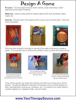 Here is a fun activity idea to play with children – Design A Game. Just gather up some various objects and let the child create a brand new game to play. You can view and/or print this helpful sample to get your creative juices flowing at Your Therapy Source.
