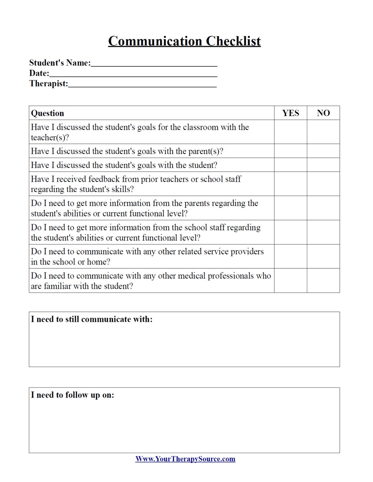 Now that the school year is in full gear and schedules are set it is time to settle in and get to know all of the students or clients on your caseload. In order to do this you will need to make sure that you communicate with all members of the team that work with a particular student. You can download a check list that you can use to ensure that the lines of communication are open between therapists, school staff and home. Go to YourTherapySource.com to download the free check list.