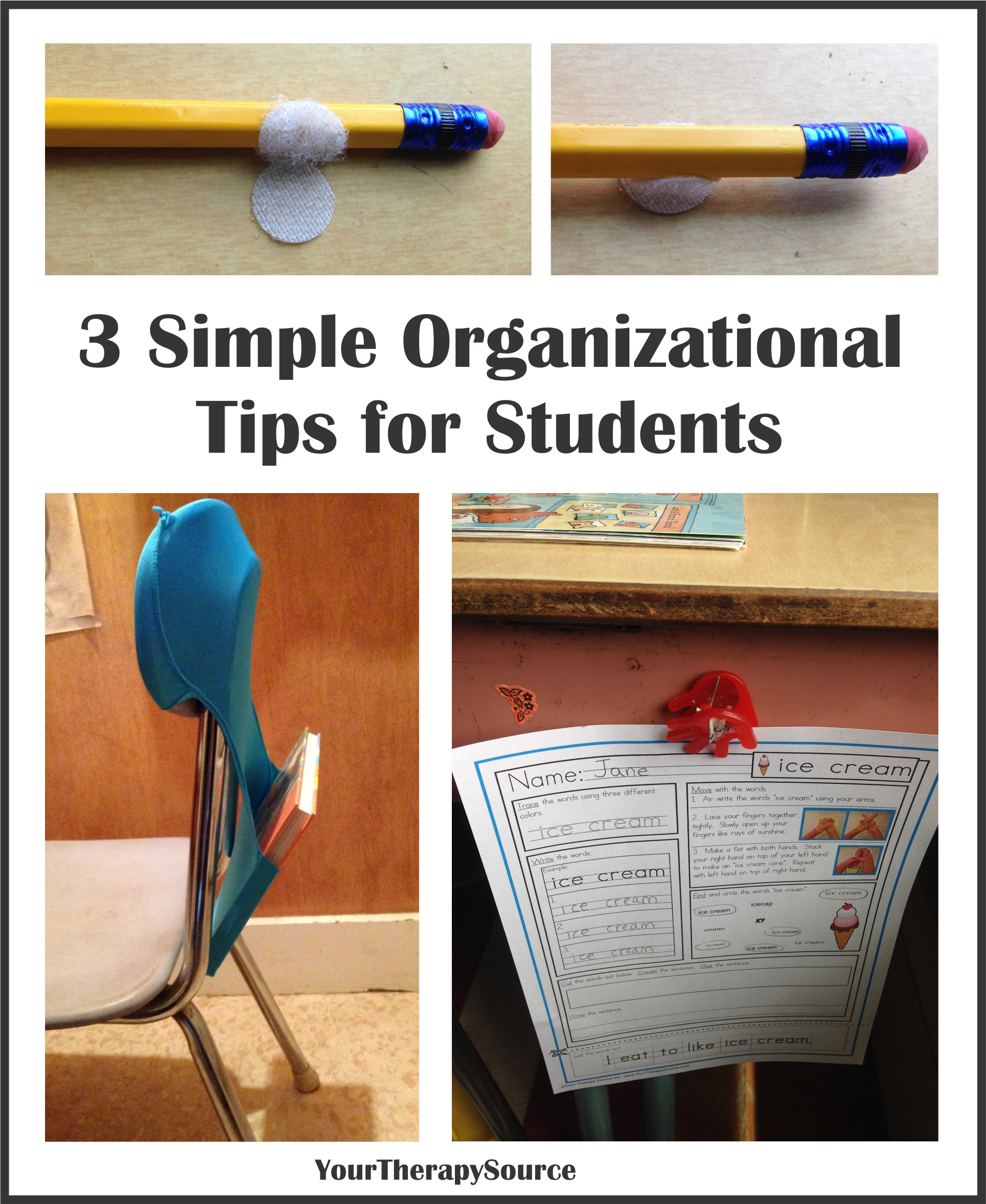 1. The Anti Roll Pencil – just put a velcro dot on the pencil and one on the desk. Now each time the student puts the pencil on the velcro dot it will not be out of reach. Have a student who likes to fidget with things? Wrap a small strip around the pencil instead of just a velcro dot.