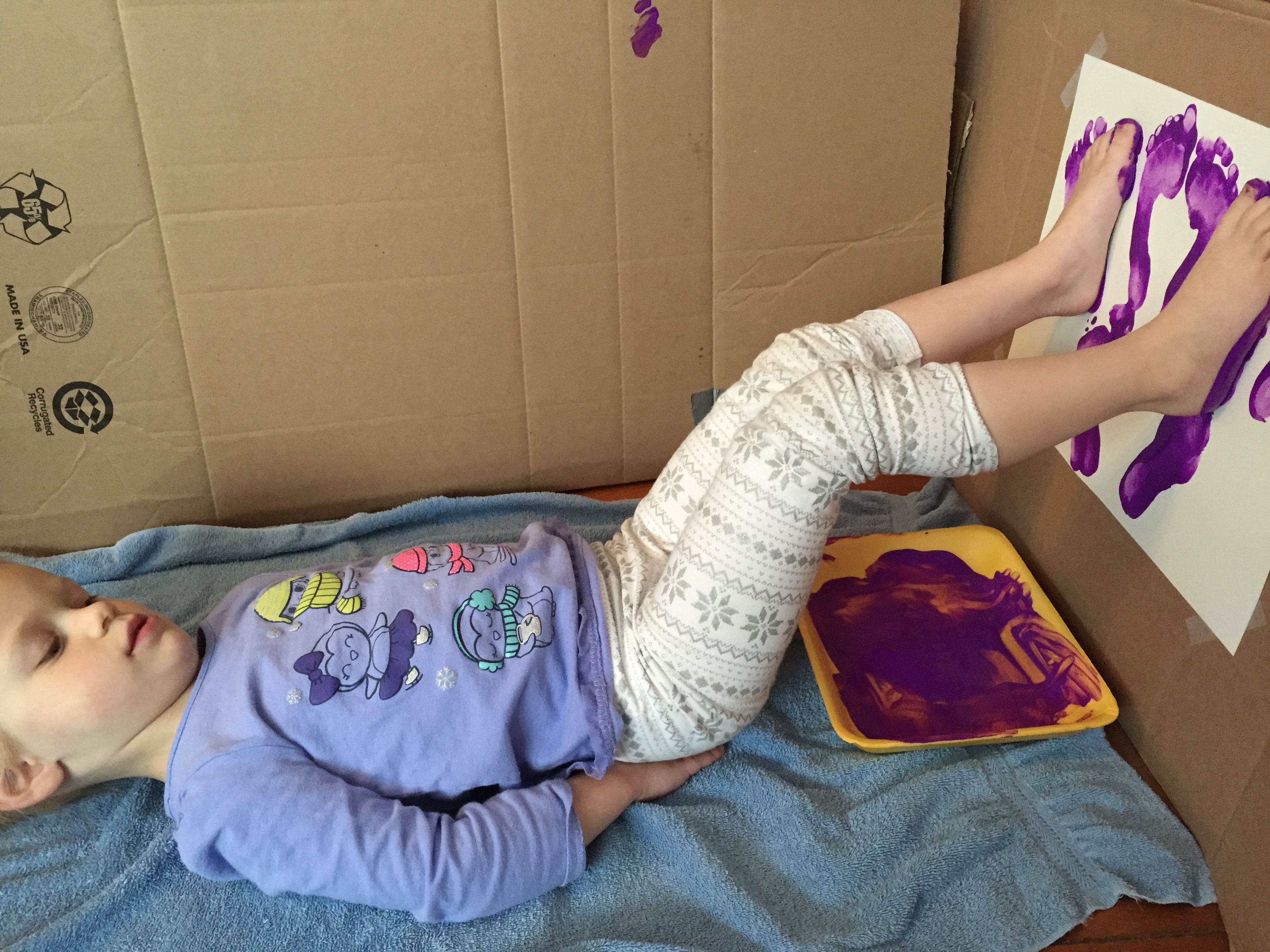 To get those abdominal muscles working, the child then puts both feet in the paint, lifts up and presses feet against the paper. Make sure the child keep the small of the back flat on the floor as they lift the feet.