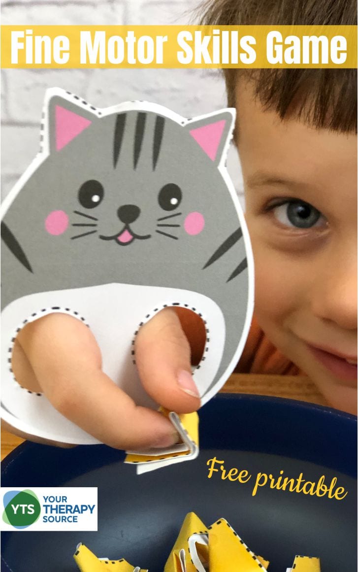 Use the cat and mouse for other activities to encourage the child to tuck the middle, ring finger and pinky finger into the palm while they use the thumb and index finger. If the child has difficulties with this, try putting a cotton ball or pom-pom in the palm for them to hold onto with the ring and pinky fingers.