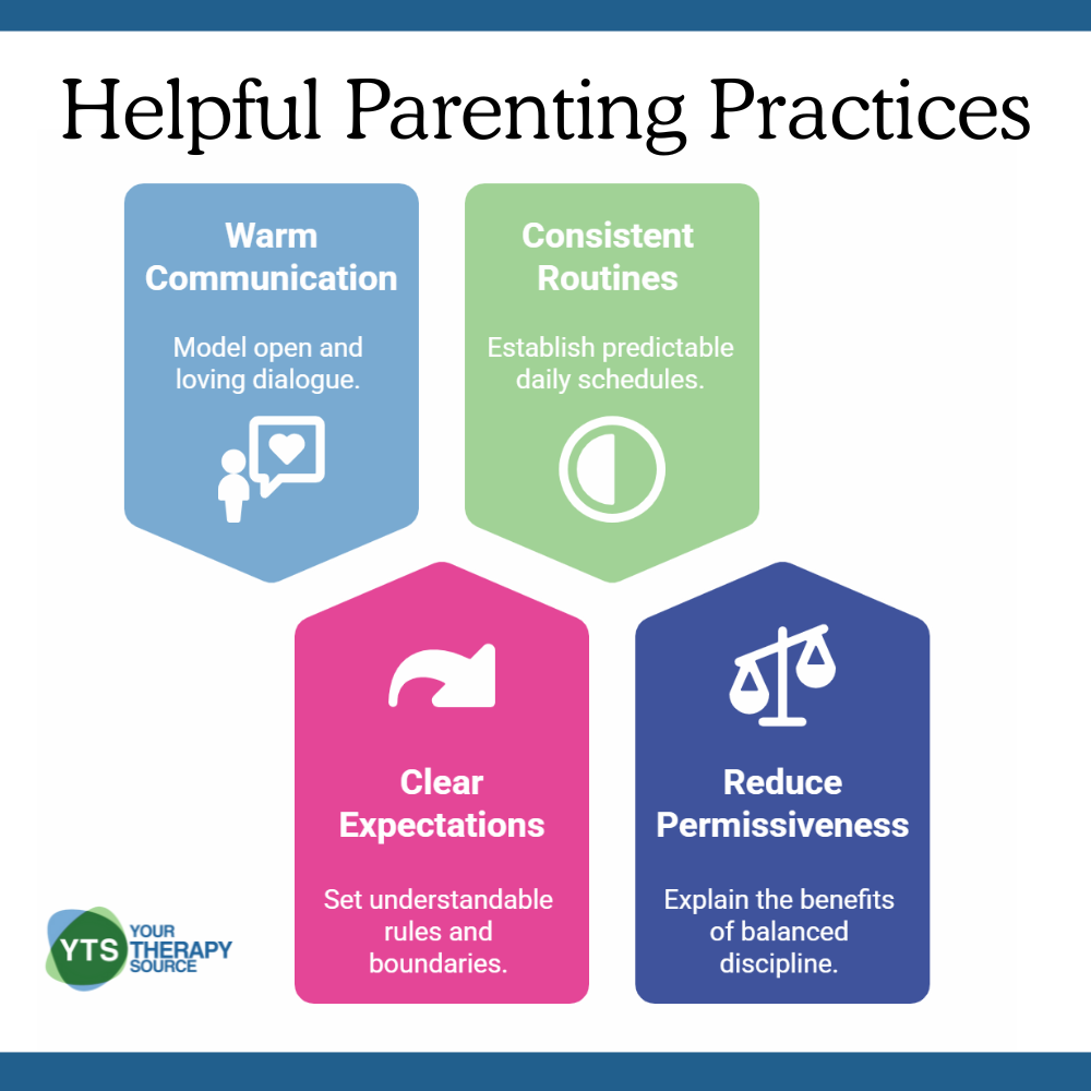 • Explain the impact of reducing permissiveness or harshness: Families may not realize how inconsistent or extreme responses affect their child’s regulation. Explaining the benefits of balanced, predictable parenting helps them make positive adjustments.
