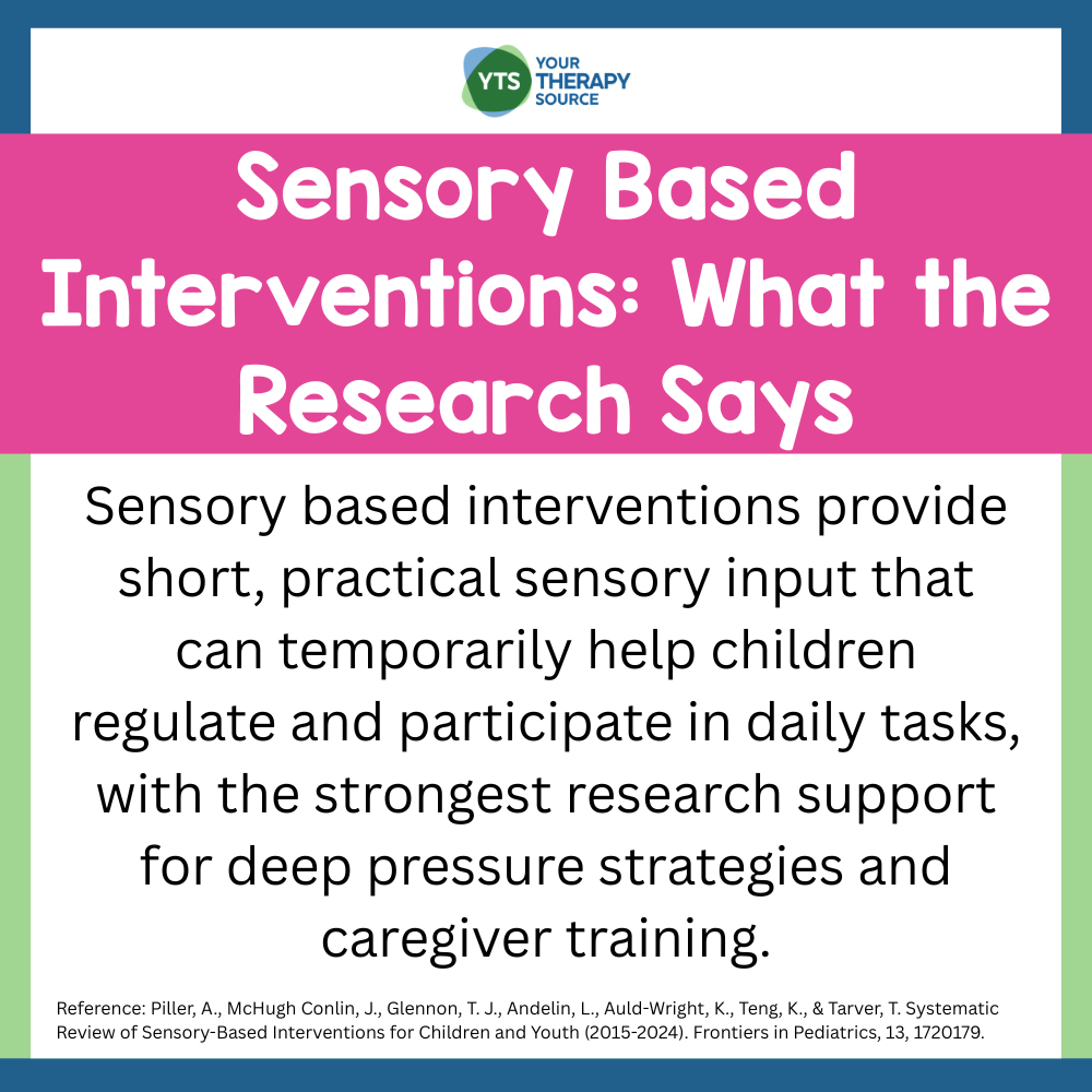 Piller, A., McHugh Conlin, J., Glennon, T. J., Andelin, L., Auld-Wright, K., Teng, K., & Tarver, T. Systematic Review of Sensory-Based Interventions for Children and Youth (2015-2024). Frontiers in Pediatrics13, 1720179.