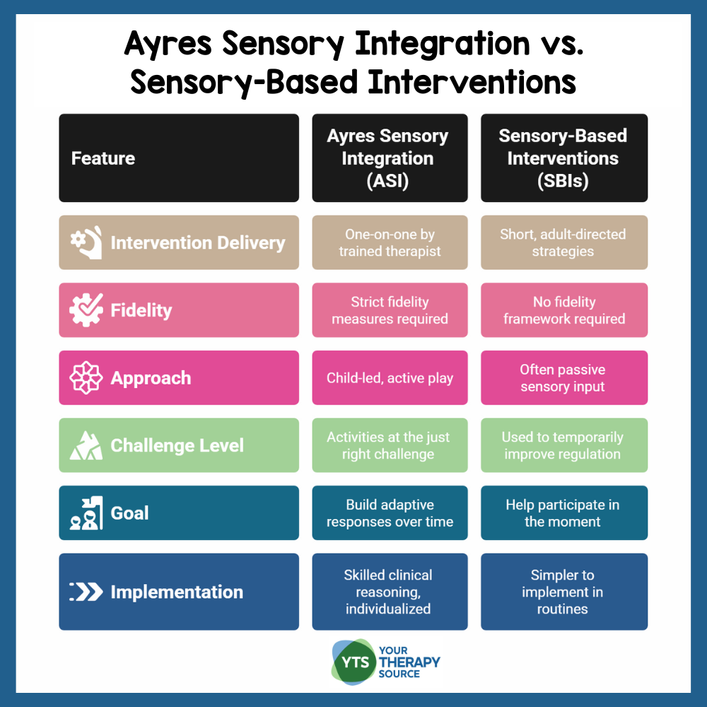 Although both draw from sensory integration theory, sensory based interventions are not the same as Ayres Sensory Integration (ASI). ASI is a specialized therapeutic approach focused on long term change in how a child processes sensory information. SBIs, in contrast, focus on immediate support for participation.