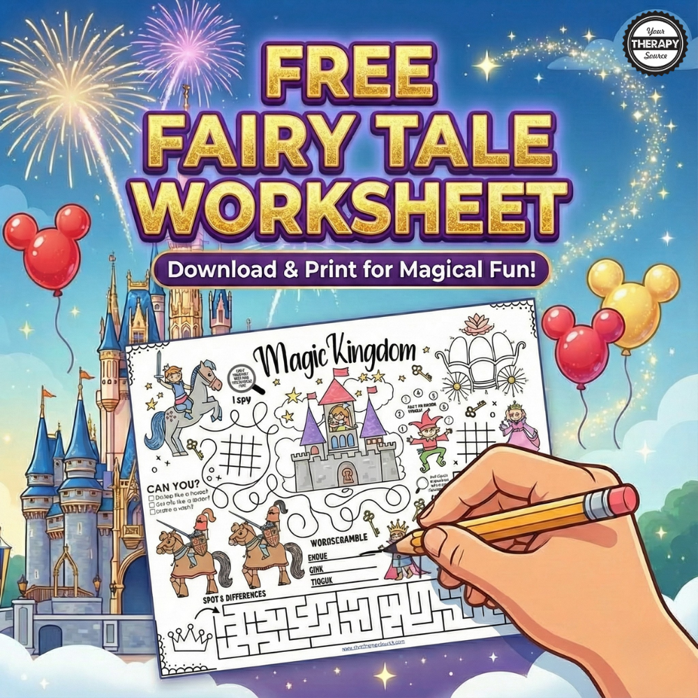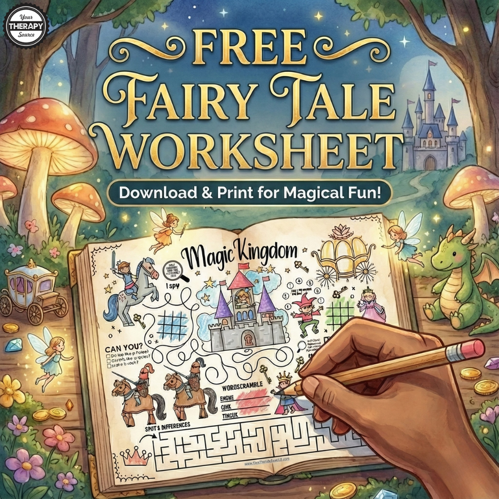 This free fairy tale worksheet offers a playful way to support visual, motor, and movement-based skills using a familiar storybook theme. The activities are designed to feel fun while still targeting important developmental areas, making this printable a great fit for therapy sessions, classroom centers, and home learning.