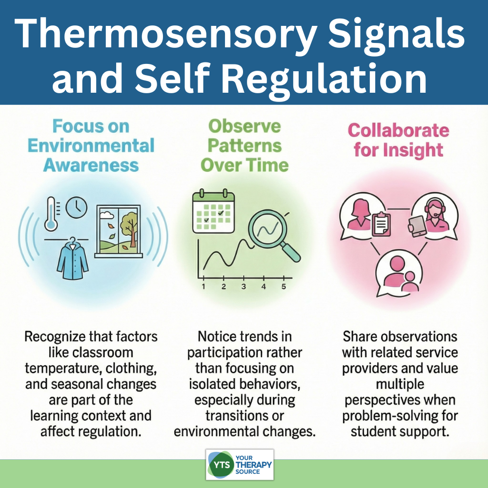 Understanding how thermosensory signals and self regulation interact can support educators and therapists in thinking more broadly about the sensory context of learning. Thermosensory signals include skin temperature and the perception of warmth or cold. In adult research, these signals have been linked not only to physical regulation but also to how individuals experience their bodies as their own, a concept known as body ownership. While this research does not examine children, it offers an interesting perspective when considered alongside existing knowledge that sensory input plays a role in motor performance, behavior, and participation.