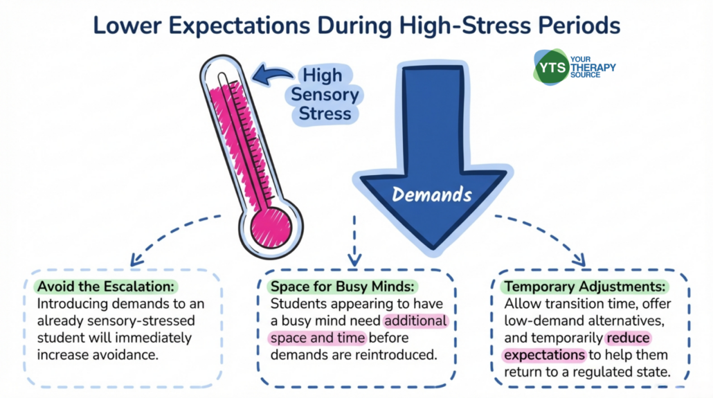- Prioritize low-demand approaches during high-sensory periods. When a student is already sensory-stressed, introducing additional demands is likely to increase avoidance. Allowing transition time, offering low-demand alternatives, or reducing expectations temporarily may support the student in returning to a regulated state. Students who appear to have a busy mind may need additional space before demands are reintroduced.