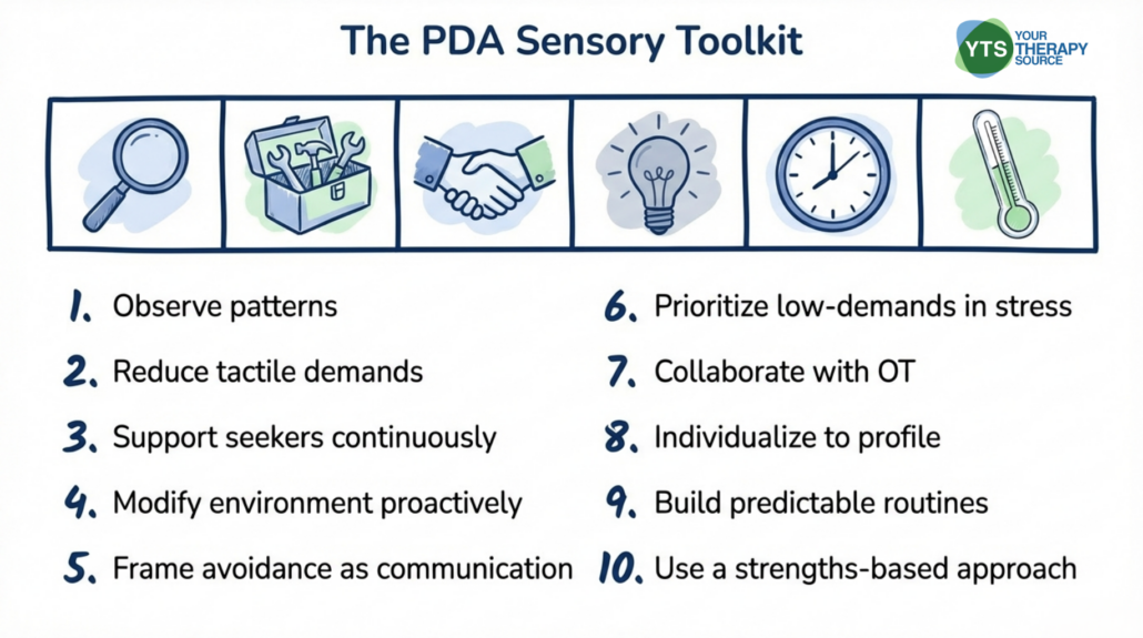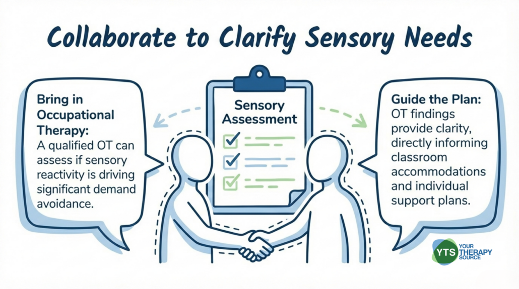 - Collaborate with occupational therapy to assess sensory needs. If a student has a PDA profile and significant demand avoidance, a sensory assessment by a qualified occupational therapist can help clarify whether sensory reactivity is contributing. This information can guide classroom accommodations and individual support plans.
