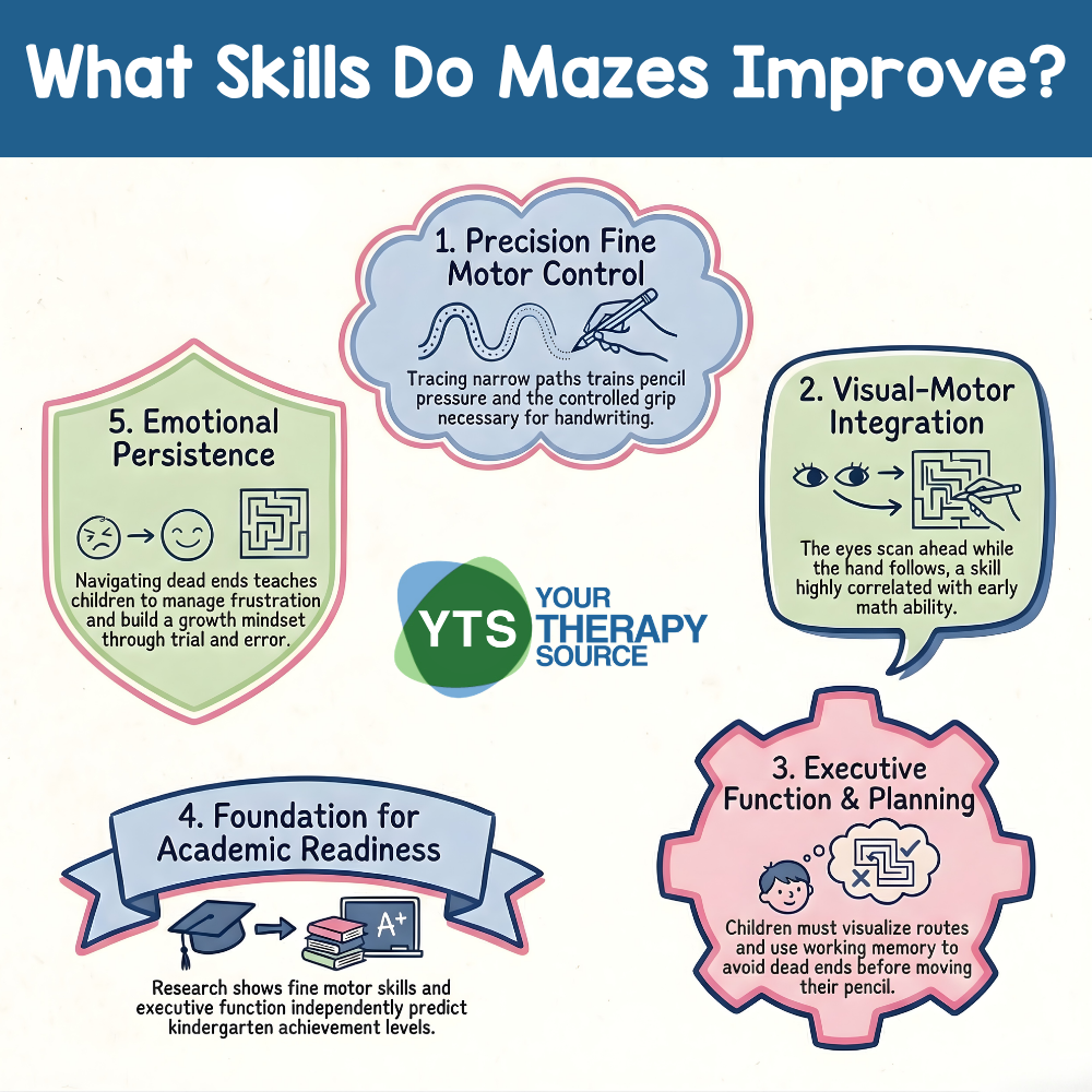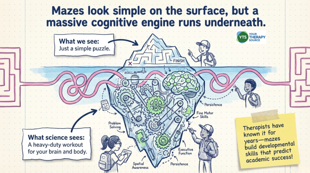 Mazes have been a go-to activity for therapists, teachers, and parents for generations. They look simple, but a lot is happening under the surface when a child picks up a pencil and starts navigating a path. Research supports what occupational therapists have long known: completing mazes on paper builds a wide range of developmental skills. Here is a closer look at the science of mazes, what skills do mazes improve, and why that matters for children.