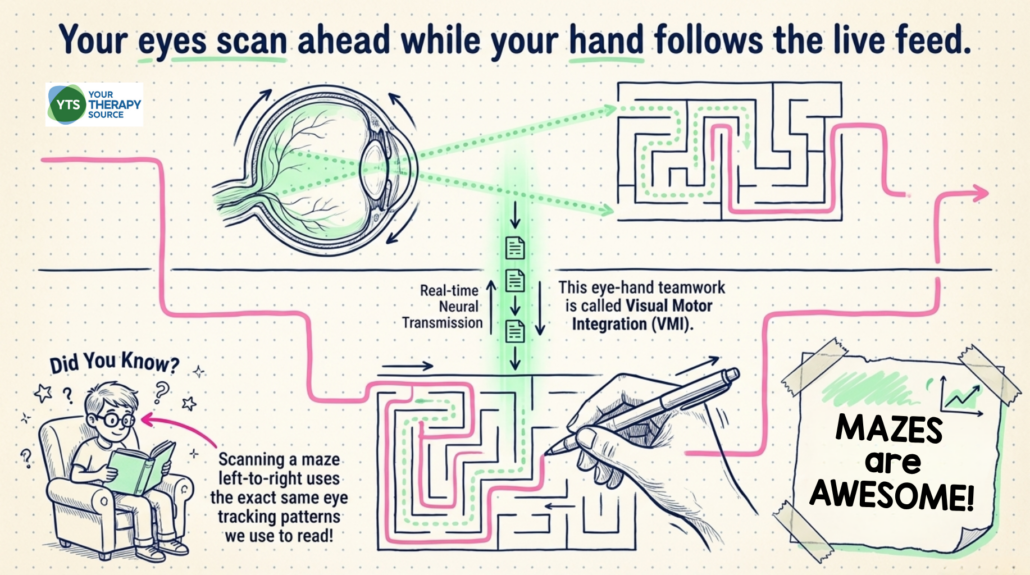 Completing a paper maze is fundamentally a visual motor task. The eyes must scan ahead to identify a clear path while the hand follows in real time. This coordination between what the eyes see and what the hand does is called visual motor integration (VMI).