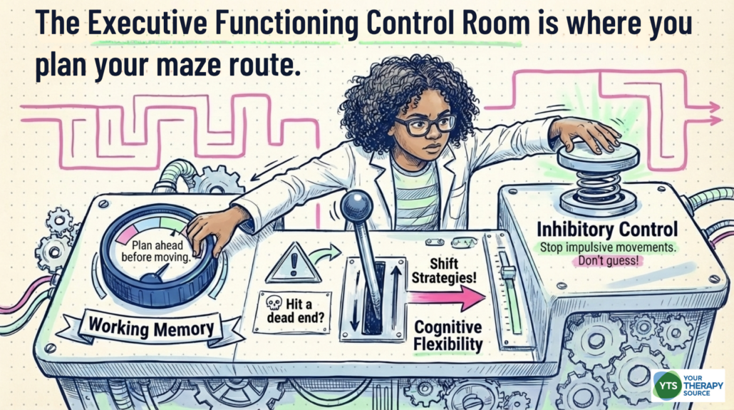 Executive functioning refers to a set of higher-order cognitive skills including planning, working memory, cognitive flexibility, and inhibitory control. Mazes engage all of these simultaneously.