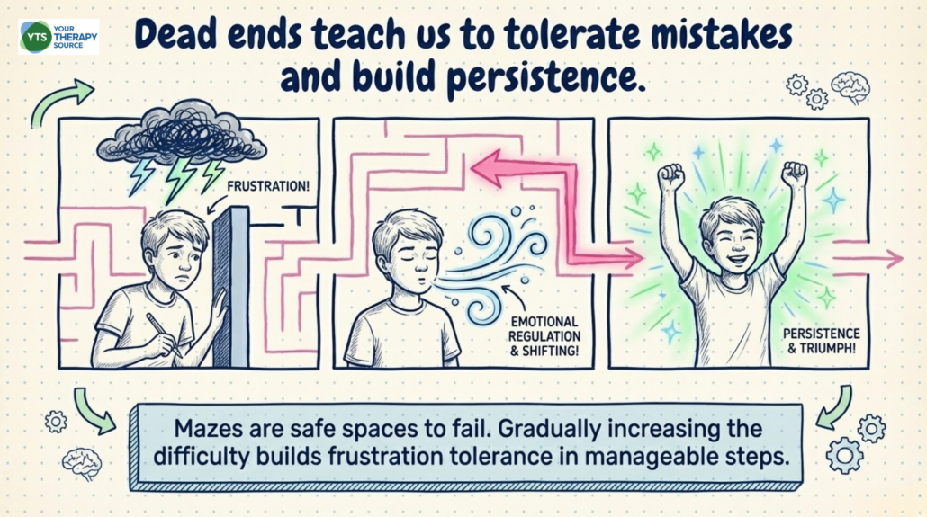 - Gradually increasing maze difficulty allows children to build frustration tolerance in manageable steps
