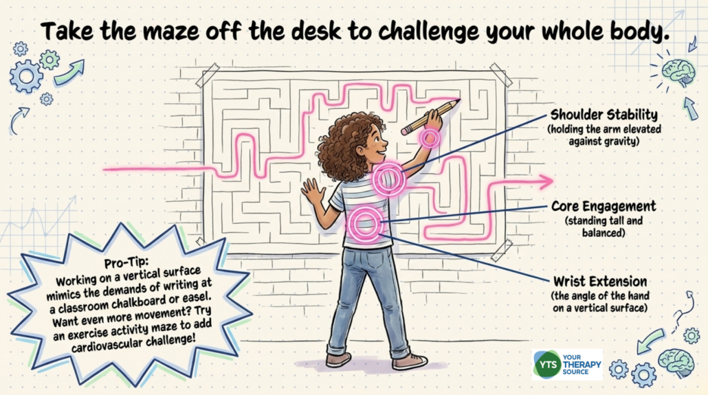 - Use vertical surfaces: Tape the maze to a wall to promote wrist extension and shoulder stability alongside fine motor goals