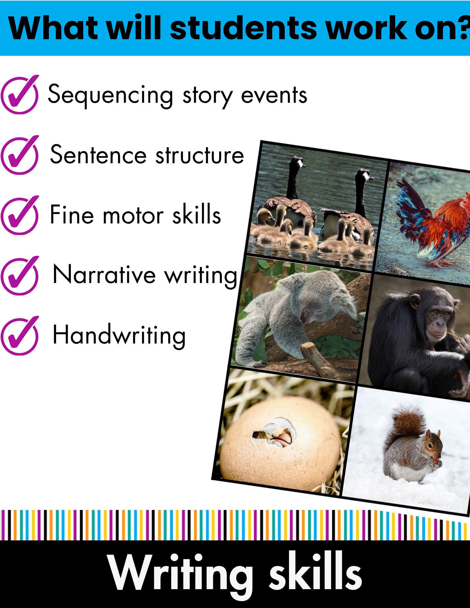 Engage young writers with Animal-Themed Writing Prompts! Perfect for kindergarten, first, and second-grade students, these prompts use real animal pictures to spark creativity and inspire narrative writing. Whether in the classroom, writing center, special education group, or occupational therapy session, these prompts help students develop storytelling, handwriting, and fine motor skills while having fun.