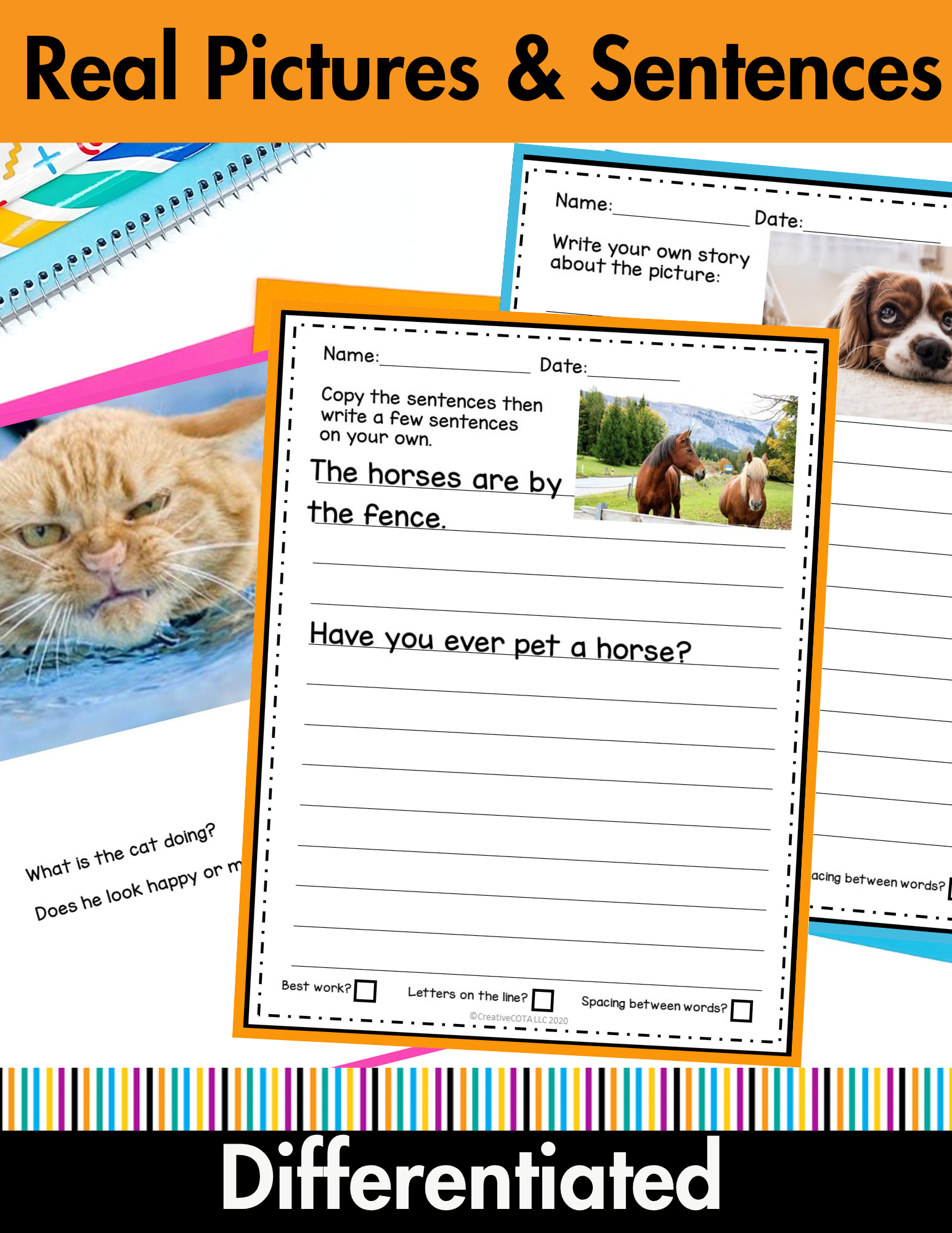 - Two Worksheet Styles: One with sentences for guided practice and one for independent writing.