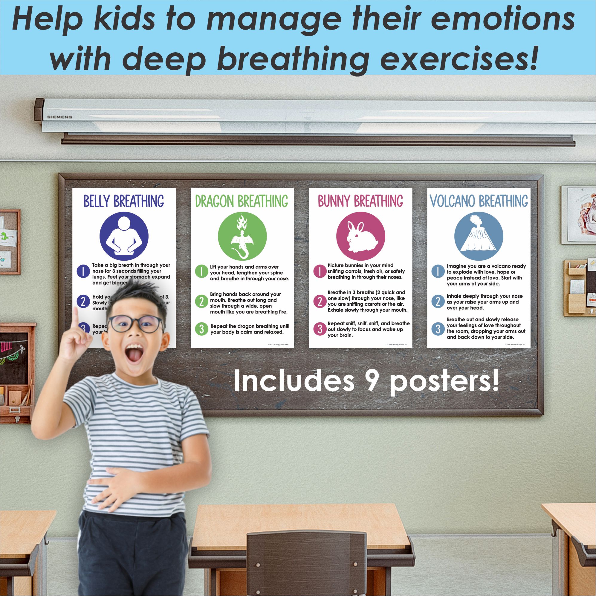 DETAILS: The 9 BREATHING TOOLS FOR KIDS POSTERS are printed in full color 11″ by 17″ on heavy, high quality, card stock 110 lb paper. MADE IN THE USA. 100% satisfaction guaranteed.
