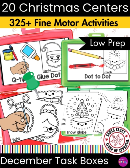 December Christmas fine motor packet includes over 325+ low-prep, skill-building tasks for cutting, coloring, gluing, and hand-strengthening practice! Designed for occupational therapy, preschool, kindergarten, and first-grade students, these activities support pincer grasp, pencil control, prewriting, and fine motor development in fun, seasonal ways.