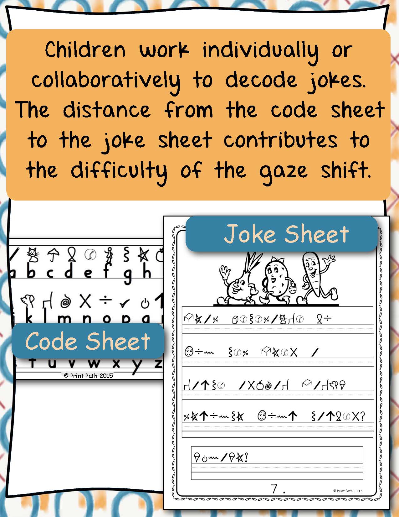 If you are working with two students or a small group, give one child the joke sheet and the second child the symbol sheet. The children with the joke sheet verbally describe the symbol, and the children with the alphabet code can tell them the letter.