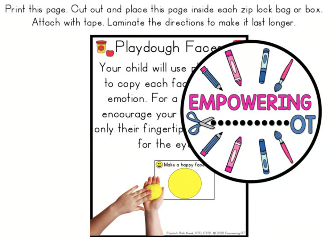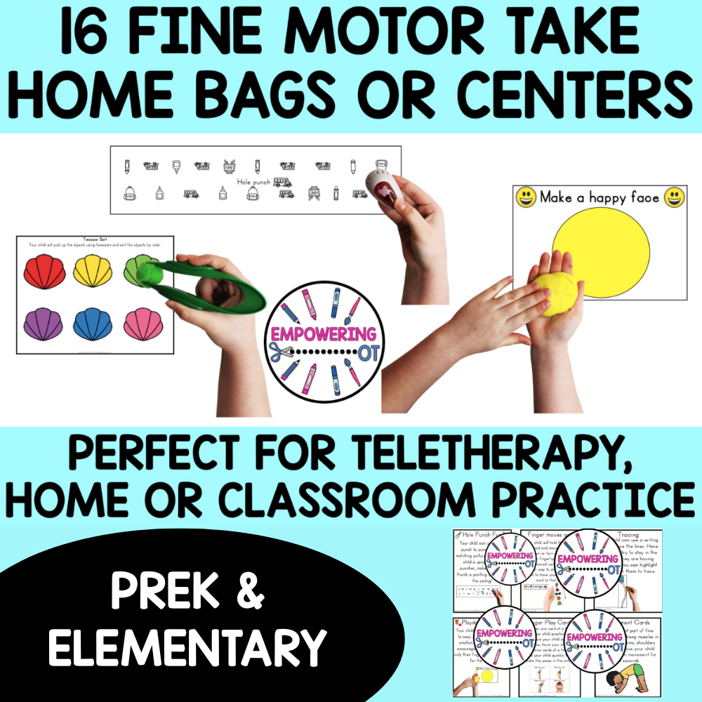 Are you looking for easy set up for fine motor take home bags for fine motor and visual motor skills for preschool, kindergarten, special education and occupational therapy? This is perfect for teletherapy or distance learning or for providing your students with extra practice at home or centers in a classroom with MINIMAL materials that you probably already have in your therapy room or classroom. Put each of these activities into ziplock bags and a backpack or small boxes!