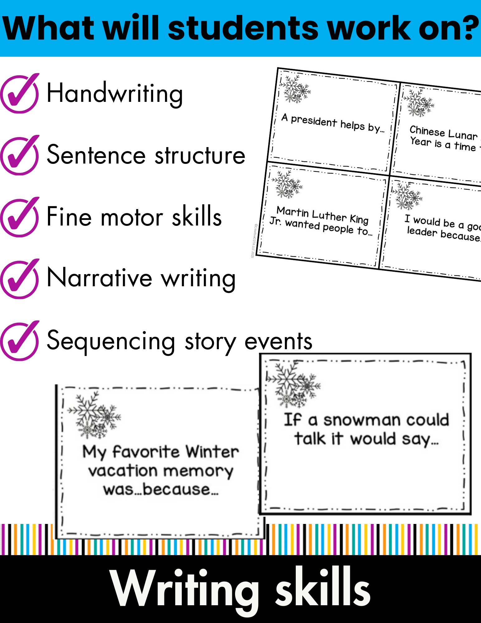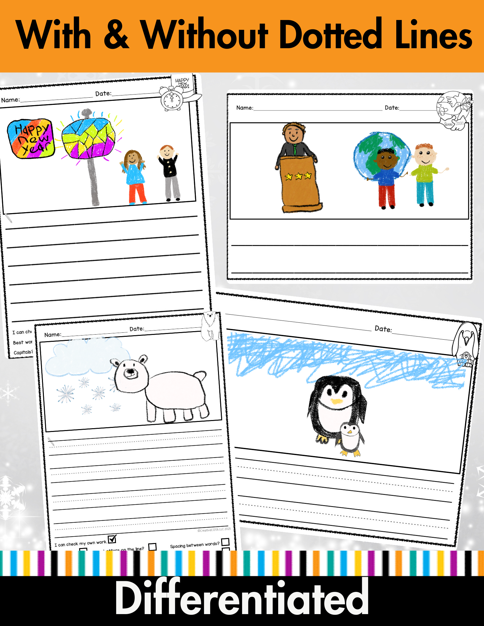 This January Winter Writing Paper templates with picture drawing boxes resource includes primary handwriting paper with drawing space, seasonal writing prompts, and winter craft toppers that can be used as simple crafts, writing toppers, or headbands. Designed for kindergarten and 1st-grade students, these no-prep writing pages support letter writing, narrative writing, informational writing, and opinion writing while also providing ready-to-use craft for a bulletin board idea in January. With multiple layouts, horizontal, landscape, and portrait, including picture boxes and seasonal images, students can draw, write, and create displays that work on both handwriting and fine motor skills.