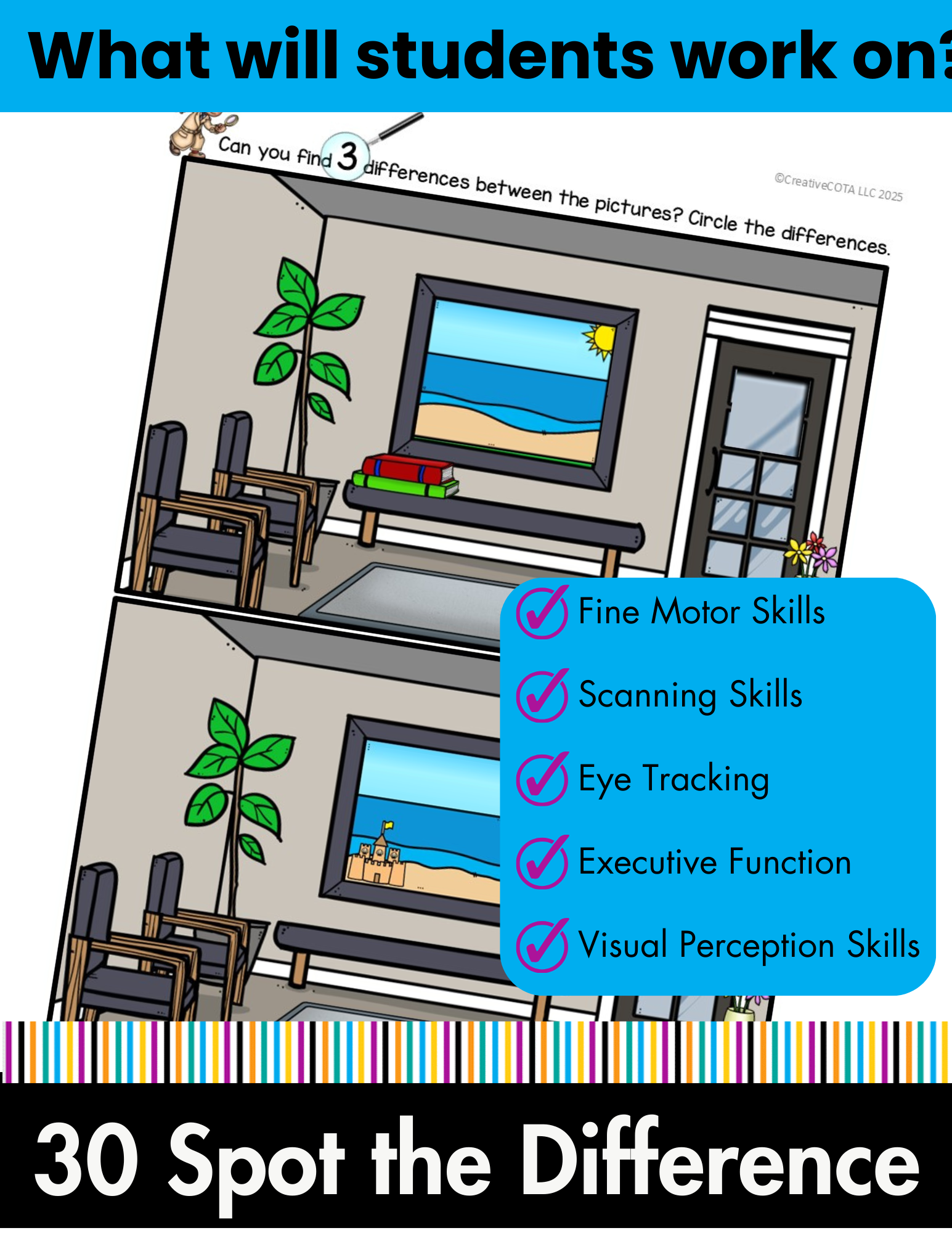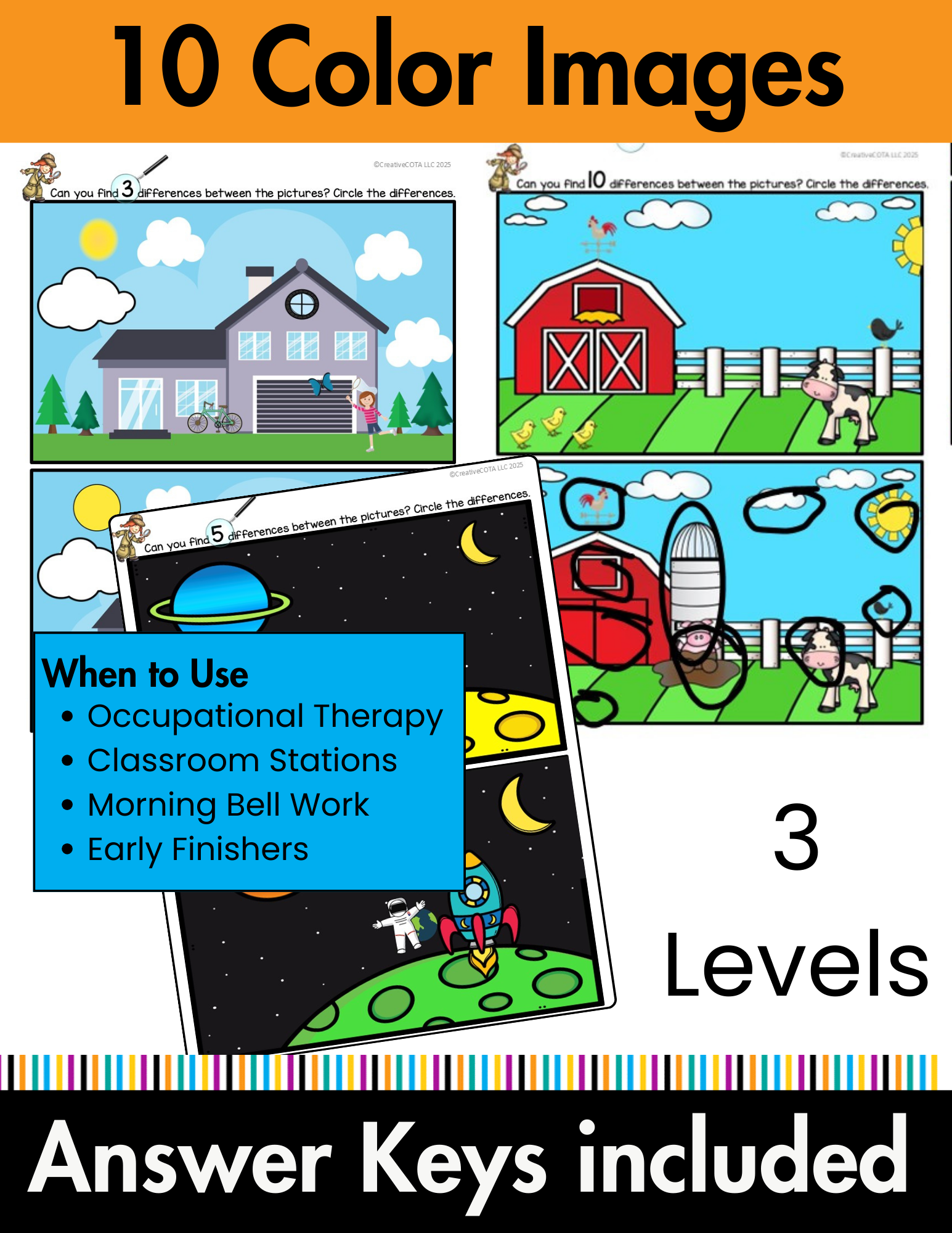 This no-prep, Spot the Difference COLOR PDF, is a visual perceptual skills activity that was designed to support students in developing eye tracking, scanning, and visual discrimination skills. These are all essential for reading, writing, and overall academic success. It includes 10 different images with 3 levels for a total of 30 different spot the difference pages. Unlike traditional spot-the-difference activities, this resource is differentiated, offering the three levels of challenge: finding 3, 5, or 10 differences for each scene. The 10 Color images are different to provide even more variety. Consider laminating color images or putting them in plastic sleeves and using dry erase markers to save ink. Prefer black and white? You can check out this resource here.