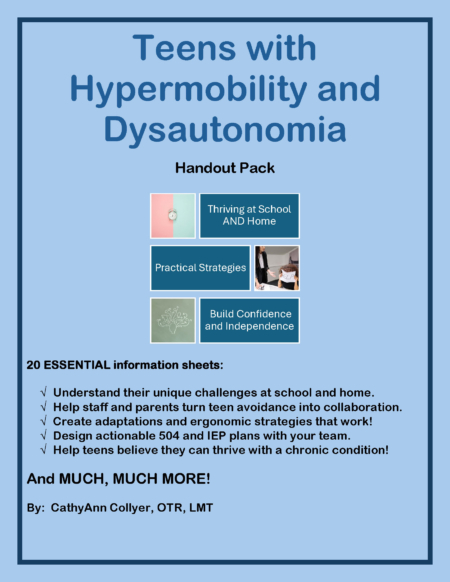 Teens with chronic conditions need a collaborative approach while we communicate effectively with school staff and their parents. This set of 20 handouts to support teens with hypermobility or dysautonomia guides effective treatment planning and provides you with take-home materials!