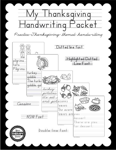 Thanksgiving Multisensory Handwriting Activities ($4.50) – Download of Thanksgiving multisensory handwriting worksheets that include movement, scissor skills, gluing, “rainbow” writing and handwriting practice. Also includes a scoring rubric to track progress.