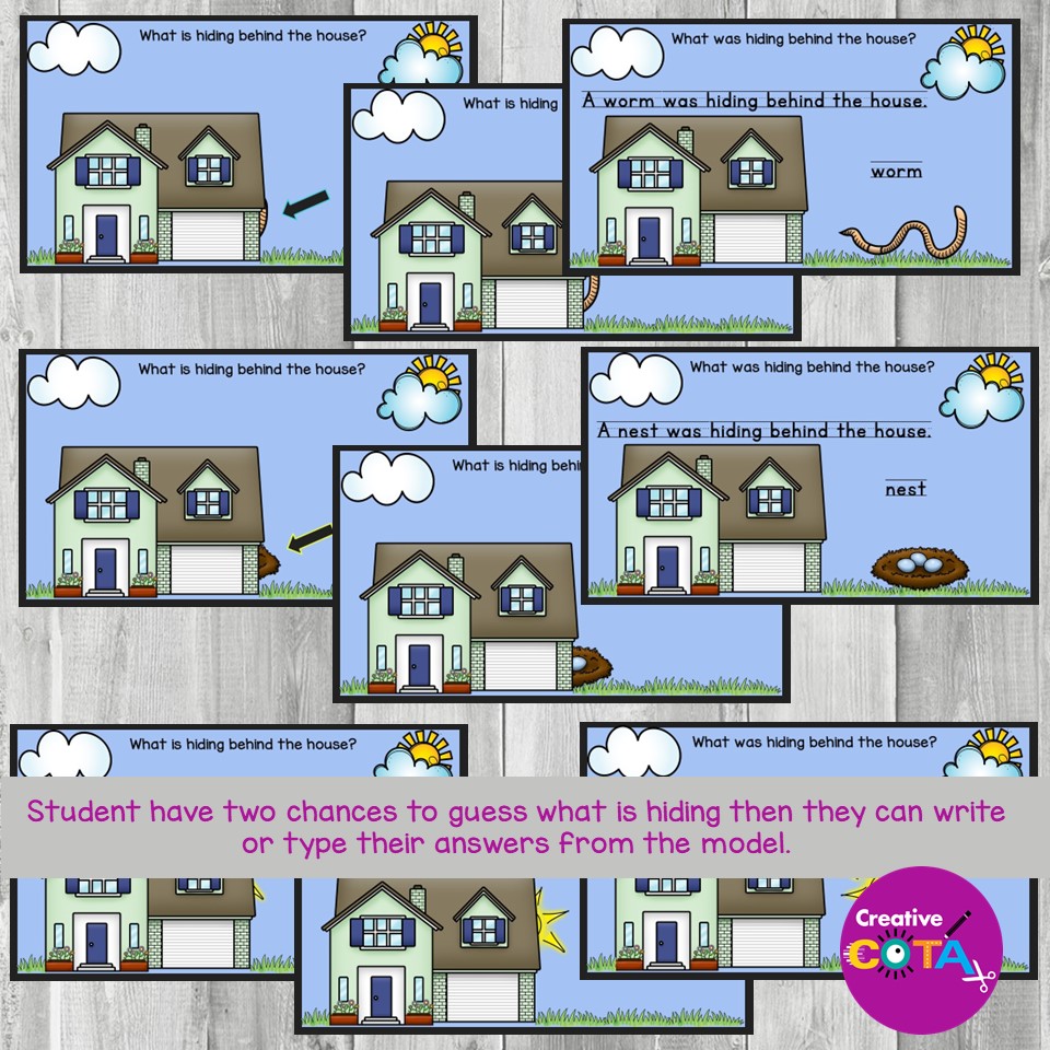 Students are given two chances to guess what delightful Spring object is hiding behind the house, followed by copying or typing the word or sentence from the model on the subsequent slide. This unique activity encourages students to hone essential skills such as letter formation, baseline adherence, spacing, speed, and letter size while having a blast.