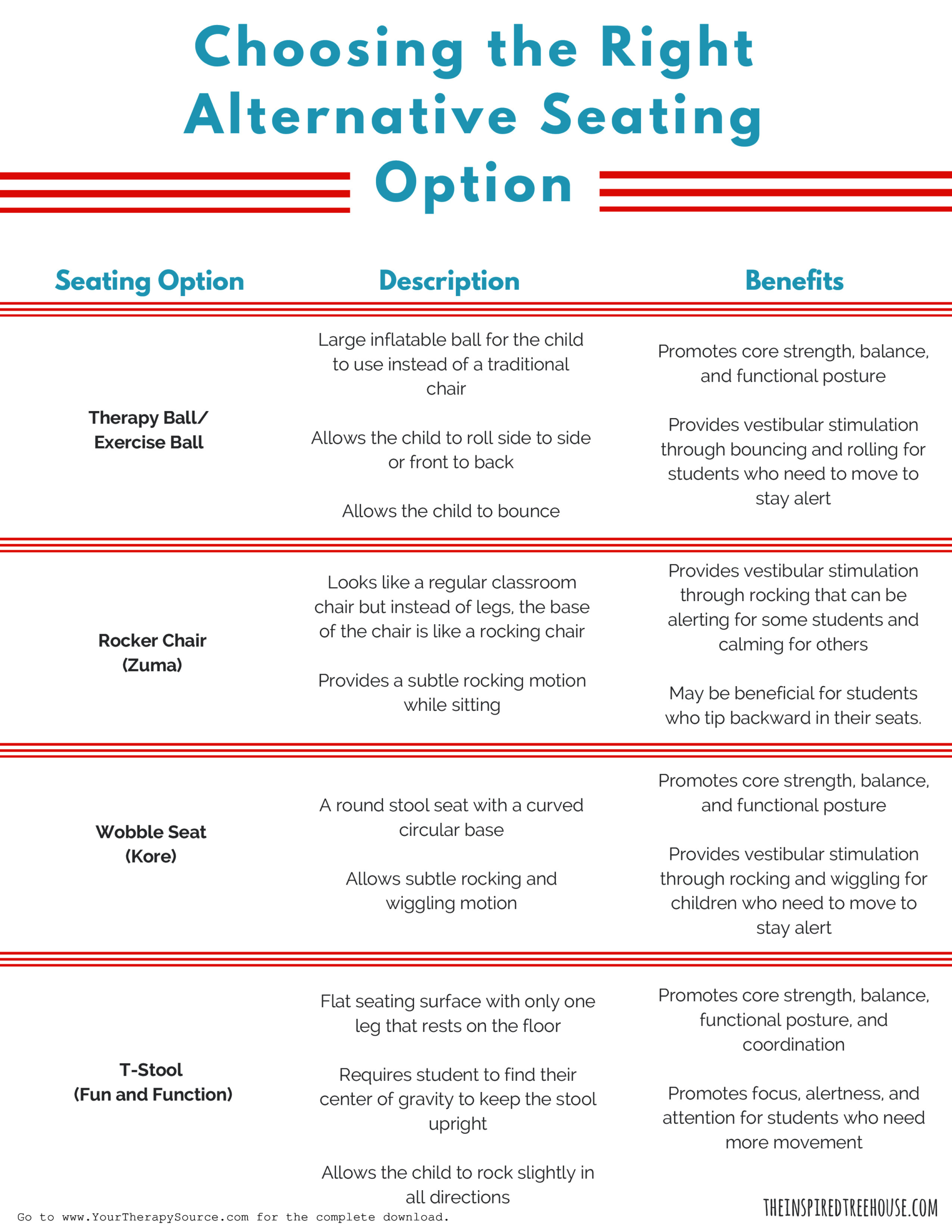 - The Benefits of Alternative Seating – Learn about why kids fidget and about the many benefits of using alternative seating in the classroom. From sensory implications to motor benefits and more, inside the guide you’ll find lots of information to support alternative seating options.