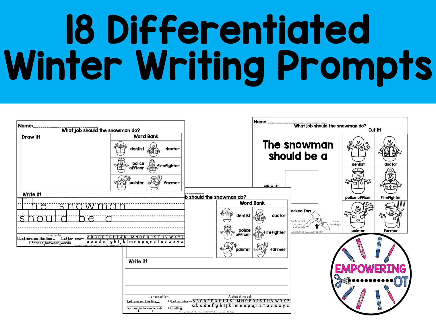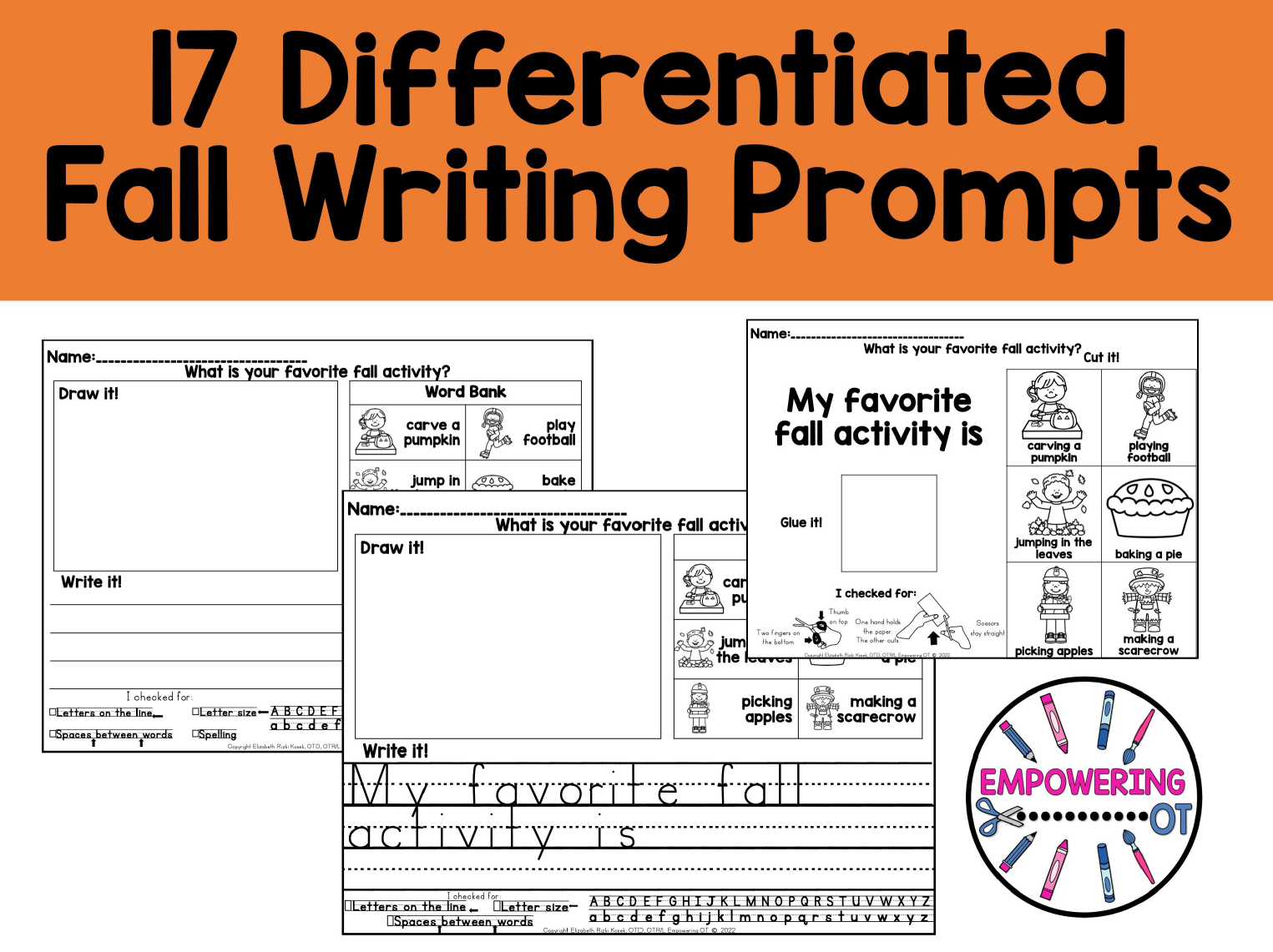 For the writing levels, this includes a simple question (ie: What is your favorite fall activity? What do you like to do on a snow day?) a box for students to draw, a word bank with pictures, a writing space, legibility check and alphabet model. For cutting levels, this includes squares to cut and VISUALs of how to cut. This is ideal for RTI/MTSS, special education classroom with multiple levels or a therapist’s caseload!