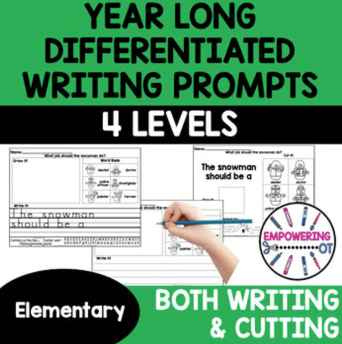 This is the resource you need to work on YEAR LONG Writing Prompts (over 60 prompts) with 4 DIFFERENTIATED levels, visual supports, alphabet model and legibility check! This includes 4 differentiated levels: 2 for writing sentences, 1 fill in the blank and 1 that is just cutting.